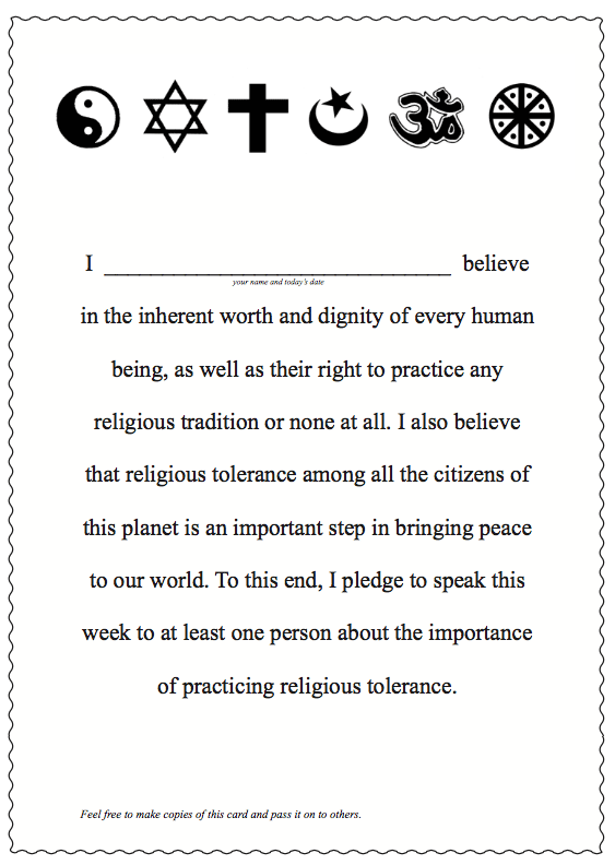 Religious tolerance is more important than ever. Please read the following beautiful entry by one of our TRIUNE members and then feel free to duplicate and distribute the religious tolerance cards below. Pledge today to support and promote religious tolerance.