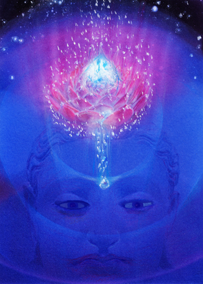 There is also a dormant centre of Chintamani in every human being. We can visualise it as the jewel on the crown of our head in the centre of the thousand-petalled lotus. From there, this energy is sometimes brought to the forehead. It is a state of being that gives us bliss and enables us to realise the purpose of our life. The jewel of Chintamani reminds us of this goal.